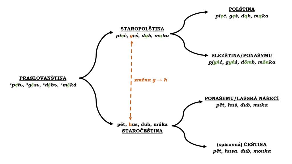 ORANŽOVĚ: polština a ponašymu si uchovaly staré g, mezitím co v češtině a ponašëmu se vyvinulo dále na h.