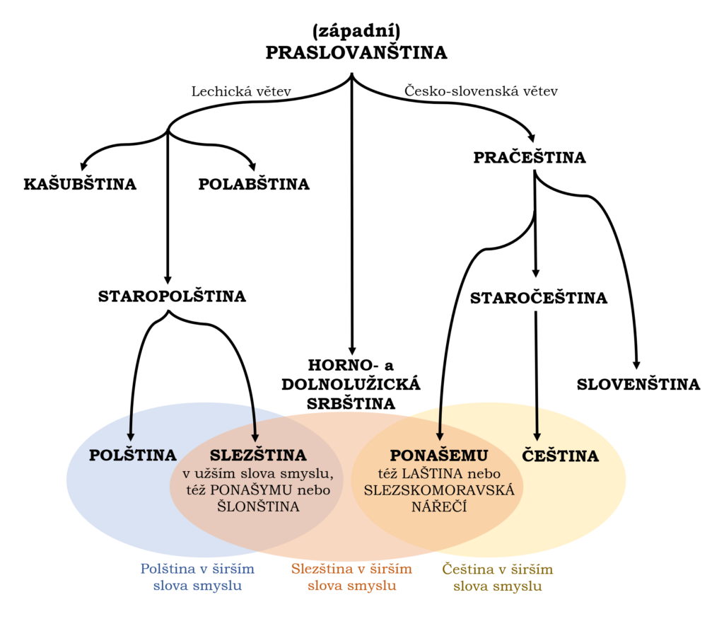 Shrňme si to následovně: Ponašemu vzniklo ze staročeštiny (byť pár rysů naznačuje jisté oddělení ještě v pračeštině), čímž se liší od slezštiny, která vznikla ze staropolštiny a kterou se mluví v polském Slezsku ale také na Těšínsku. Zhruba od této doby, tedy někdy v údobí 11. až 13. století, začalo docházet ke štěpení ponašemu od zbytku českojazyčného prostoru, tedy k vzniku rozdílů mezi tím, jak se mluvilo tady u nás, a jak na Moravě a v Čechách. Za tímto oddělením mohl stát jeden hlavní faktor – mezi zdejším územím a Moravou na jihu se tehdy od Hrubého až po Nízký Jeseník rozprostíral hvozd, který značně omezoval kontakt mezi mluvčími na obou jeho stranách a tím brzdil či zamezoval šíření jazykových inovací tím kterým směrem. Tomuto hvozdu nejspíš vděčíme i za pozdější politické vývoje – již v tomto období způsobil, že se původně moravská Holasická provincie postupně začala ekonomicky i politicky vzdalovat Moravě, postupně se změnila na víceméně samostatné Opavské knížectví, a to se následně nejprve fakticky a od 17. století de iure stalo jedním z knížectví slezských, ke kterým mělo politicky a hospodářsky beztak blíž. Nezabránilo tomu ani vyklučení a osídlení tohoto hvozdu v průběhu vrcholného až pozdního středověku, protože nově vydobytá území osídlili především německojazyční osadníci, kteří tak z jazykového hlediska v podstatě bývalý hvozd jen zastoupili, protože ať už se na Moravě prosadila jakákoliv jazyková změna, německy hovořící člověk ji ani nepřebral, ani nepředal našim předkům tady na severu.